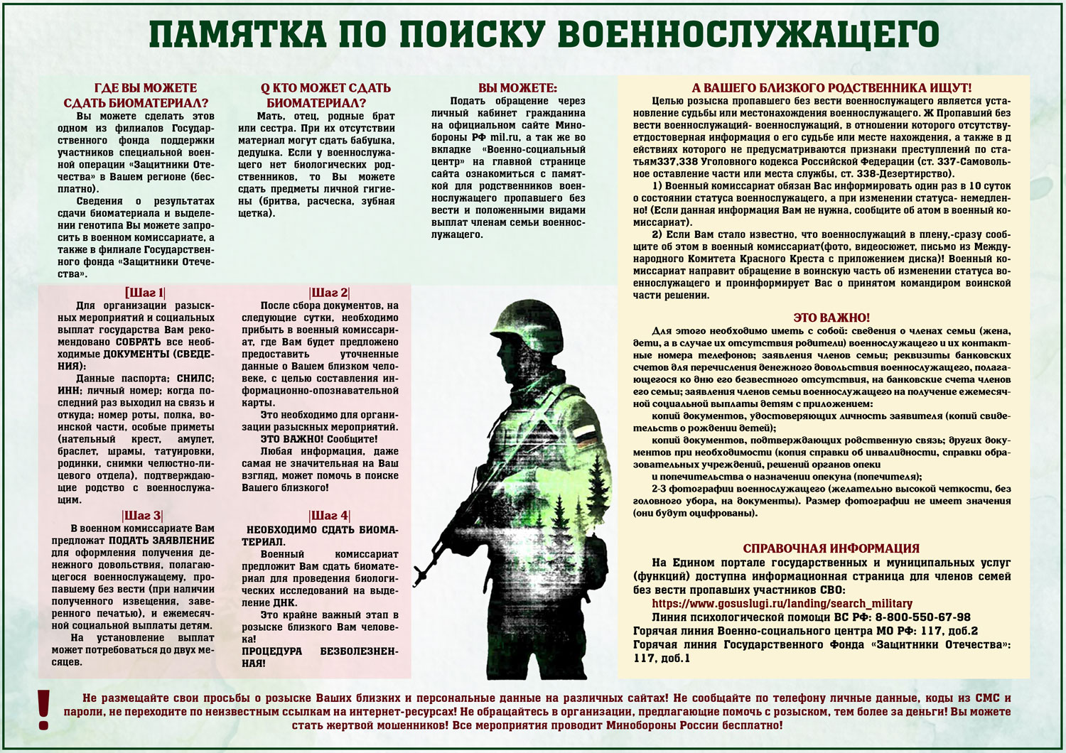 Министерство обороны Российской Федерации продолжает реализацию комплекса мероприятий, направленных на розыск и установление личности военнослужащих, пропавших без вести или погибших в ходе специальной военной операции. Эти действия предпринимаются для защиты прав и социальных гарантий...